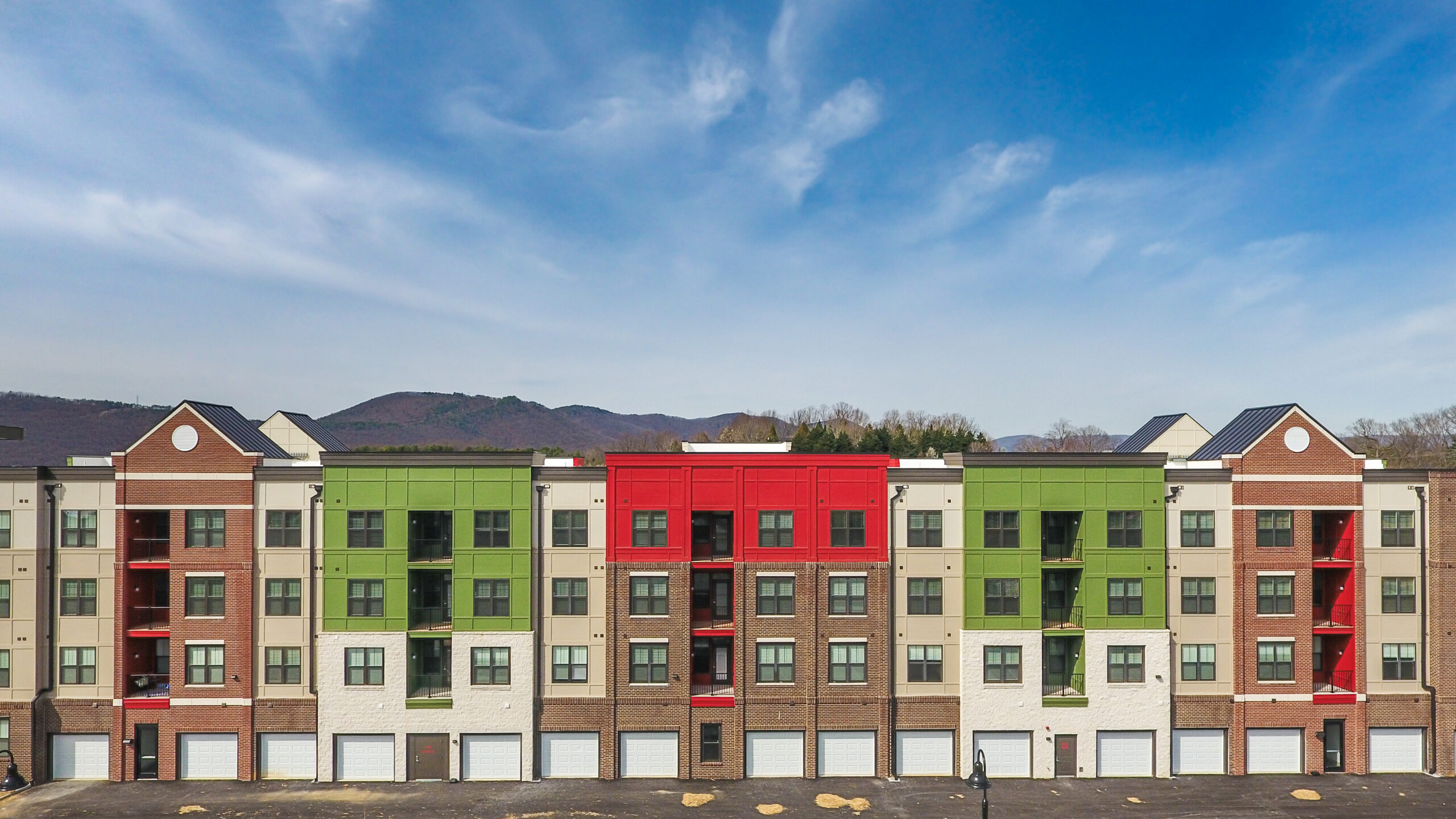 These four-story apartment buildings feature 186 total parking spaces, including 25 private garages located on the first level for convenient and secure access. Each unit includes a private balcony, offering residents comfortable outdoor space and scenic views while maintaining the community’s modern and cohesive design.